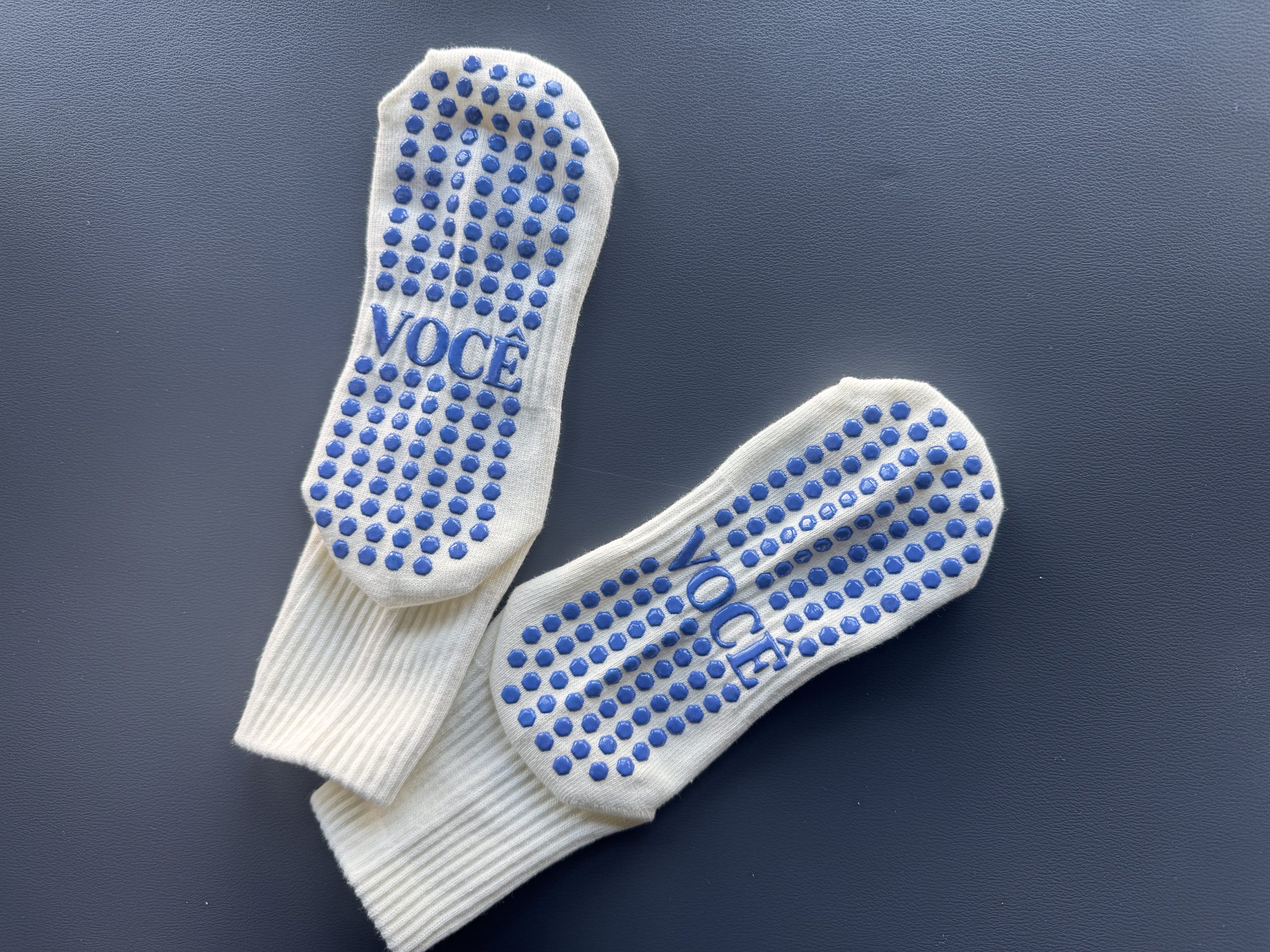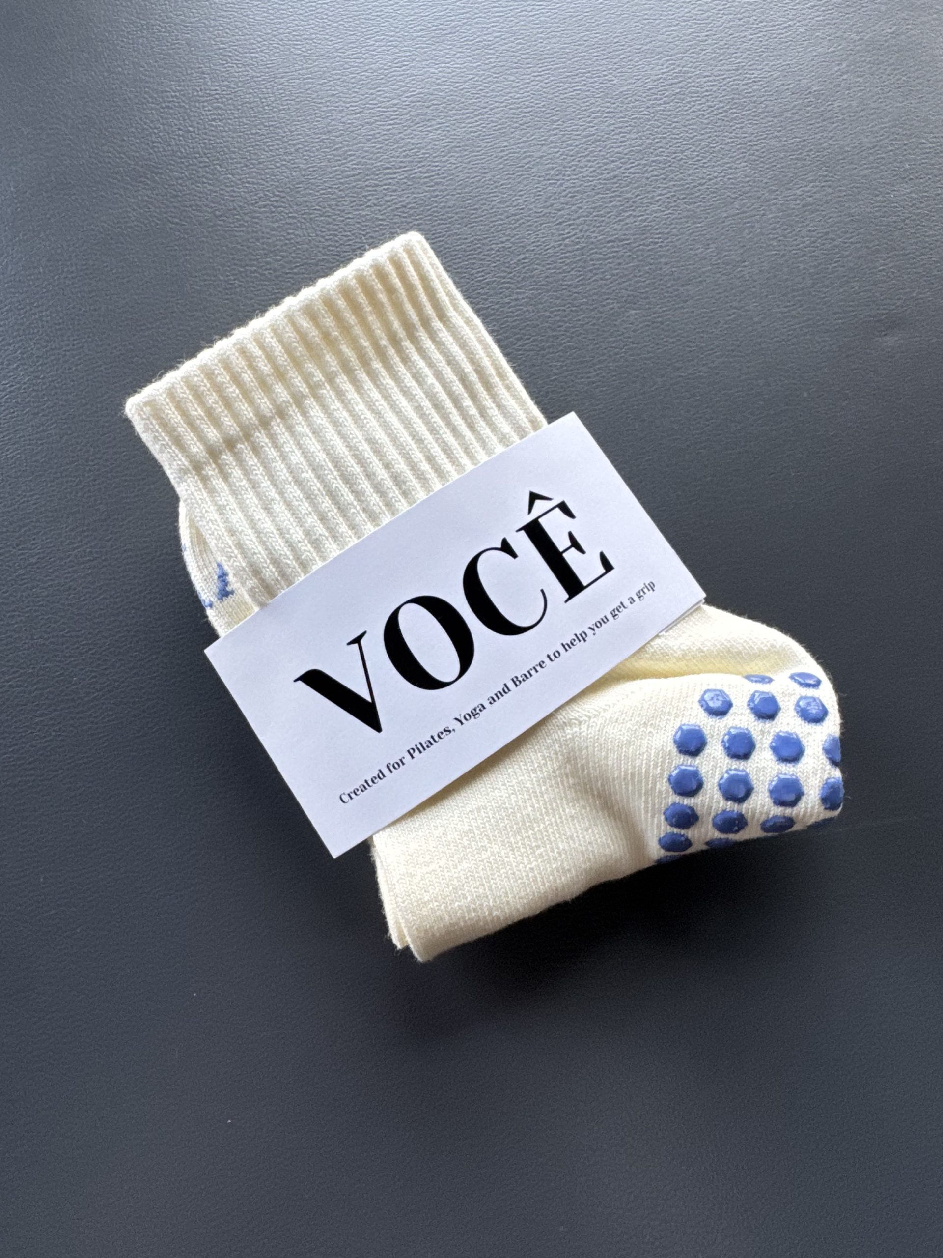 A soft buttermilk cream base meets vibrant blue detailing, with INHALE on one foot and EXHALE on the other, designed to guide your movement and bring you back to your breath. Finished with our signature VOCÊ blue grip sole for maximum stability and control.